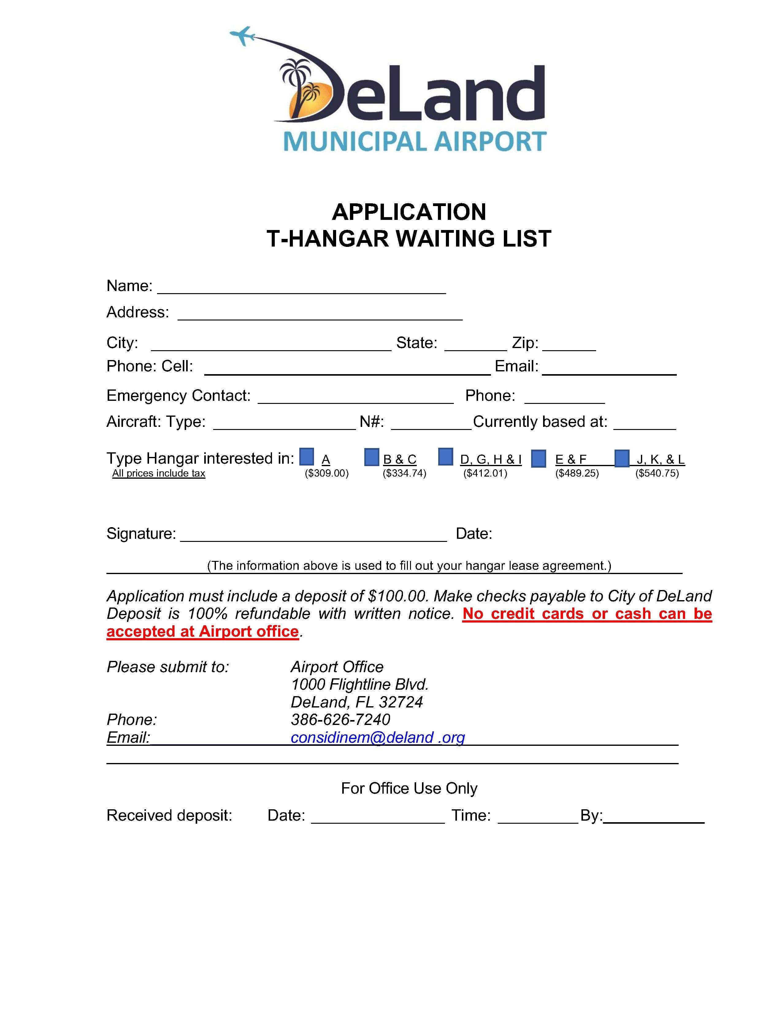 Hangar space for aircraft storage is currently at full occupancy. To be placed on our T-Hangar waiting list please complete the T-Hangar Application (JPG) and submit with the $100 deposit to the following address: (Please make checks payable to: City of DeLand)